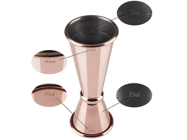 The Copper Jigger is an indispensable bar tool designed to deliver precision and style. Crafted from quality stainless steel with a durable PVD copper coating, this jigger ensures accurate pouring and reduces waste and spillage. Its dual-sided design offers precise measurements of 25ml and 50ml with clearly marked increments of 15ml and 35ml respectively.
