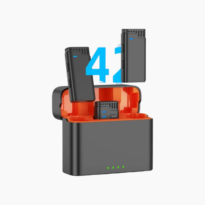• Enjoy extended recording sessions with individual microphones offering 6 hours of continuous use, and a portable charging case providing a total of up to 42 hours of power.