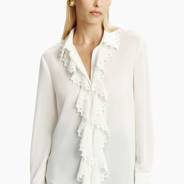 Crafted from premium polyester, the Jolanda Lace Trim Frill Shirt combines comfort and elegance in one piece. Its smart frill cuffs and concealed button closure add a polished finish, making it a versatile choice for those who appreciate understated luxury.
