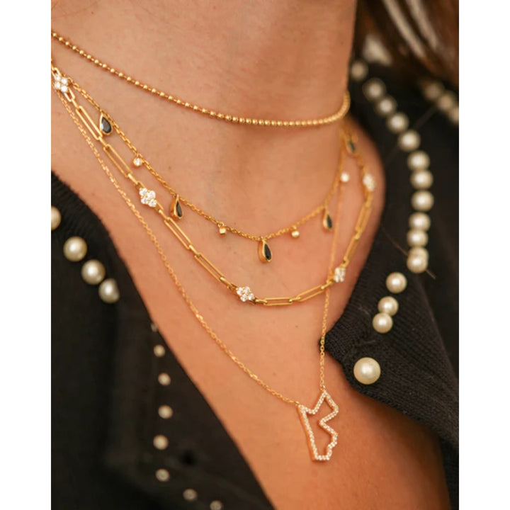 Meticulously fashioned from lustrous 18-karat gold, this necklace is adorned with high-quality cubic zirconia stones that capture and reflect light with breathtaking brilliance, adding a touch of sophisticated sparkle to any look.