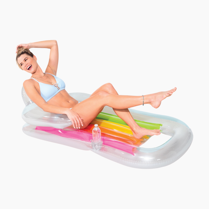 Enjoy ultimate comfort while floating under the sun. With its built-in backrest, armrests, and a convenient cup holder, this inflatable lounge transforms any pool day into a luxurious relaxation experience. Its vibrant, transparent design with colorful stripes adds a fun and stylish touch to your summer moments.