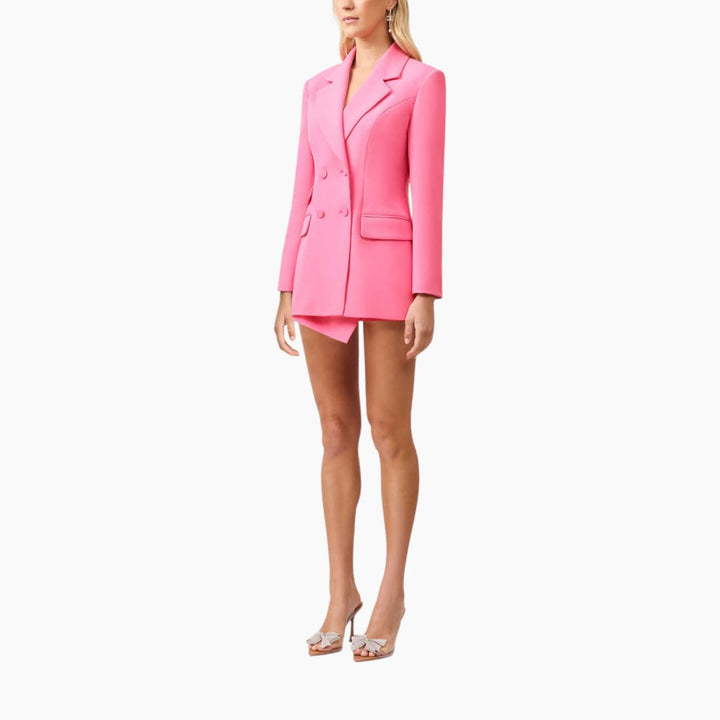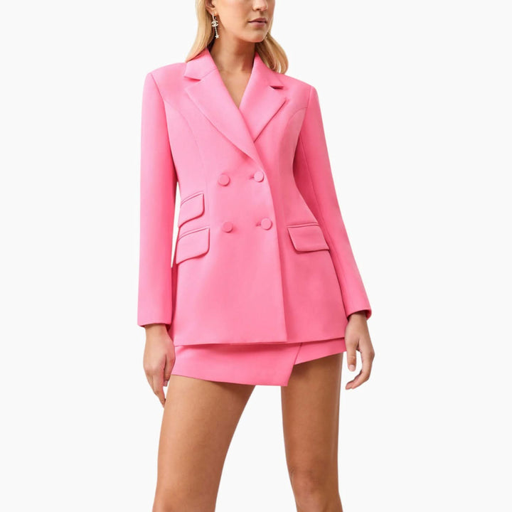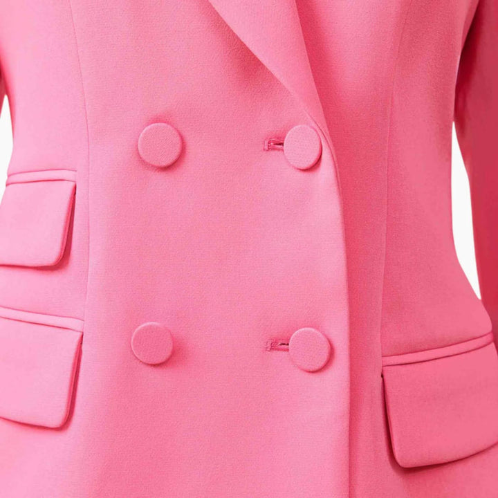 - Product Name: Klara Blazer in Pink - Design: Double-breasted front with x4 button closure - Fit: Tailored silhouette with structured shoulders - Material: Structured suiting fabrication, fully lined - Details: Notched lapel, front welt pockets - Model Measurements: Height 5'10" / 178 cm, Bust 33.5" / 85 cm, Waist 24.5" / 62 cm, Hips 35.5" / 90 cm; Model wears size S