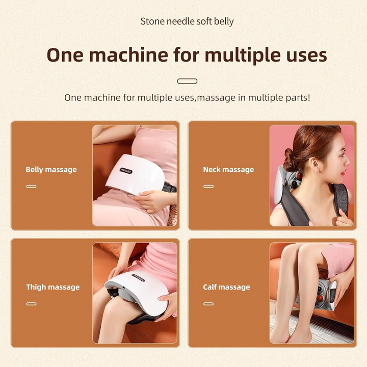 An advanced, full‑body massage experience designed primarily for the abdomen and waist—and extends to neck, legs, and back. Equipped with real Bian stone massage heads, adjustable heat and speed settings, and a secure wear‑strap for hands‑free use, it brings spa‑level kneading right into the home.