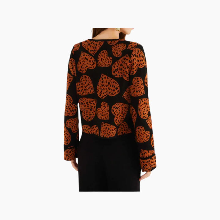 A statement knit that fuses fierce animal motifs with flirty design. Featuring a rich jacquard weave of leopard hearts and a tie-front closure, this piece delivers expressive style wrapped in cozy comfort.