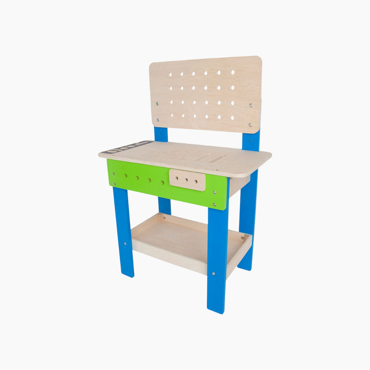 Encourage hands-on learning and creativity with this thoughtfully designed wooden tool bench, featuring ample work and storage space for young builders.