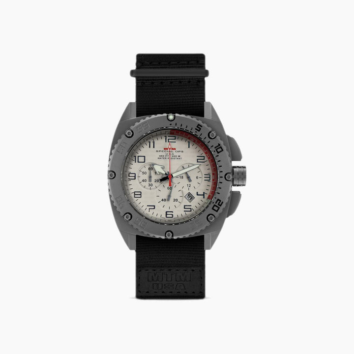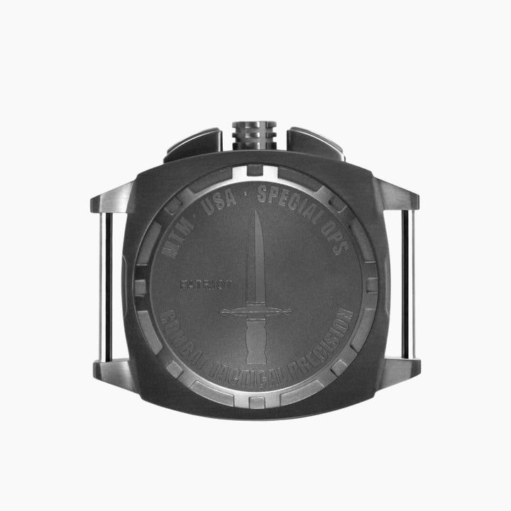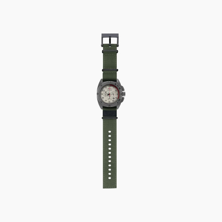Patriot Chronograph Watch, a robust military timepiece crafted for those who demand durability and precision. Designed with a NASA-grade carbon fiber or brass dial and featuring subdials within a solid titanium case, this watch exudes strength and resilience. Its locking screw-down crown ensures water resistance up to 660 feet, making it a reliable companion for adventures and challenges.