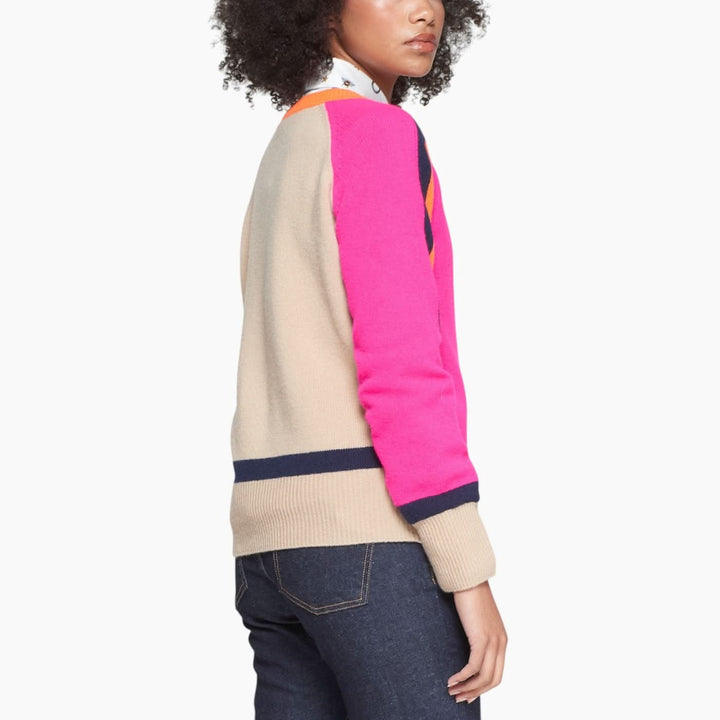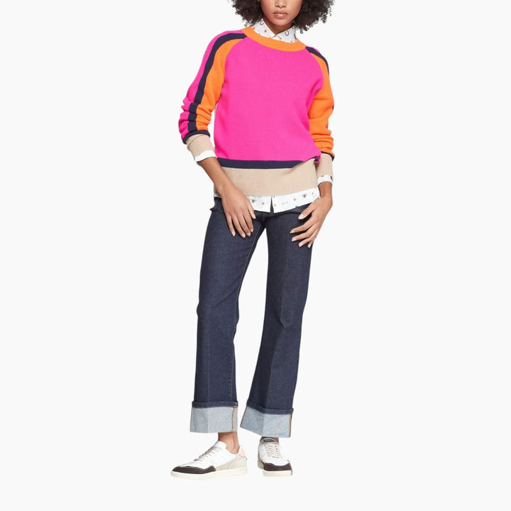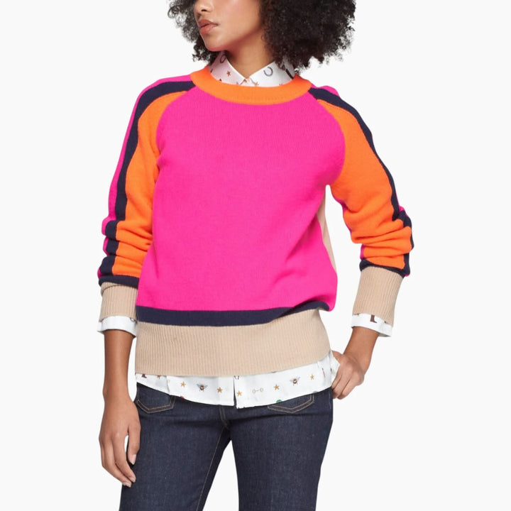 A bold and stylish addition to any wardrobe. The sleeves feature striking blocks of orange, fuchsia, and navy, complemented by an orange ribbed crew neck and beige and navy ribbed cuffs and hem. Its straight cut with dropped shoulders and structured feel provide both comfort and a contemporary silhouette.