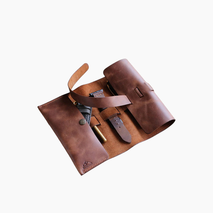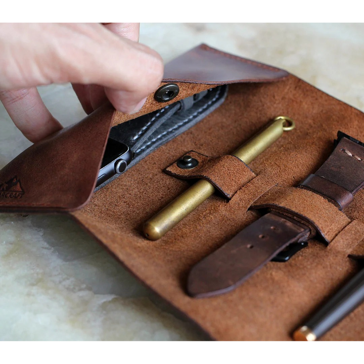 Discover the elegance and versatility of the Roll Up Pen Case Perge Brown, designed for those seeking both style and practicality. Crafted from LWG certified full-grain leather, this premium pen case offers a sophisticated solution for organizing essentials. Perfect for pens, watches, straps, chargers, and cables, its adjustable closing strap ensures everything stays secure. Handmade to perfection, each piece has its unique charm due to its artisanal craftsmanship.