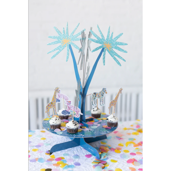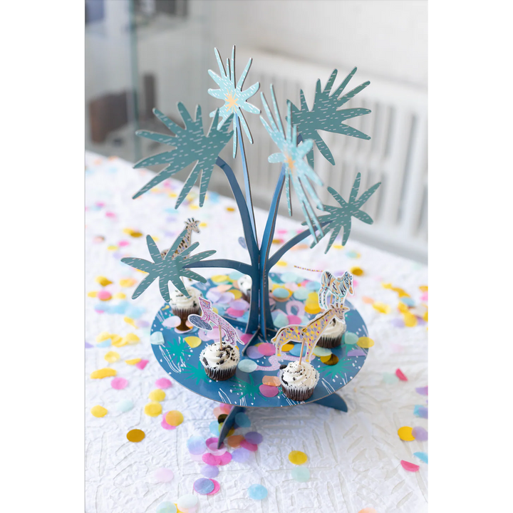 Enhance your safari-themed celebration with a captivating centerpiece that brings the wild to your dessert table. Crafted from eco-friendly paper, this stand features a unique tree design in a vibrant teal hue, adding a touch of adventure to any party setting. Its lightweight and sturdy construction ensures both functionality and style.