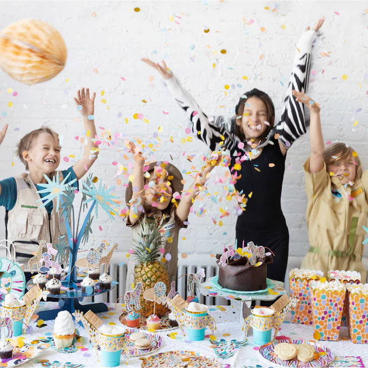 Enhance your animal-themed birthday celebration. This delightful pack includes 8 paper cups and 8 giraffe-shaped sleeves, each adorned with gold foil accents and a realistic paper mane, bringing a touch of safari magic to your party.