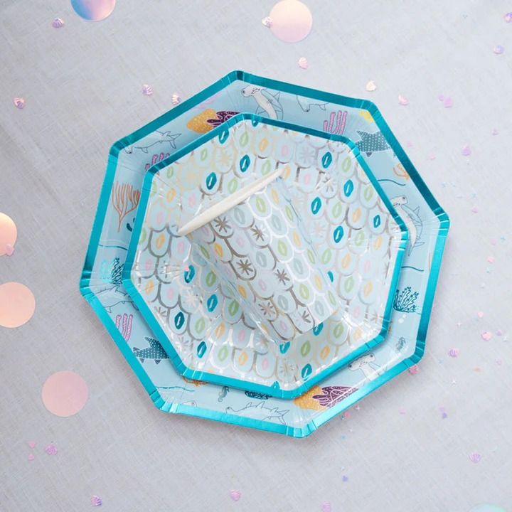 - Eye-catching fish scale print and silver foil accents enhance the undersea theme.