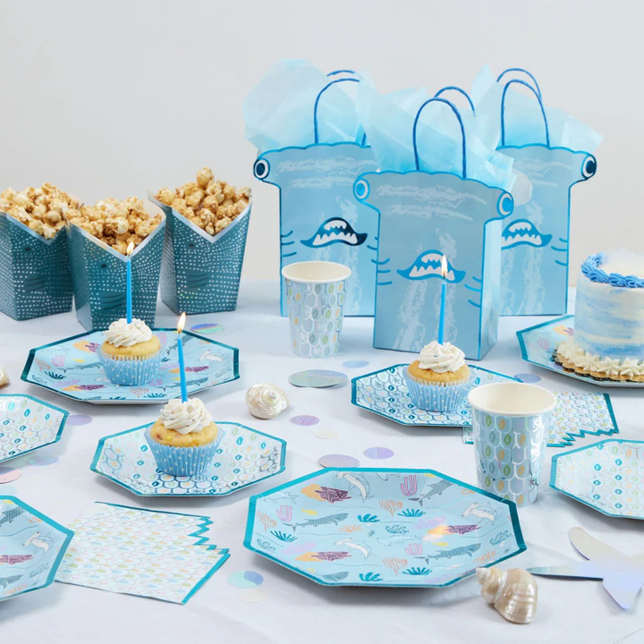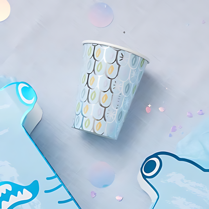 Enhance any shark-themed celebration with these captivating Paper Cups. Designed to bring the oceanic world to your party, these cups feature a vibrant blue hue complemented by shimmering silver foil details and a unique fish scale print. Perfect for both children and adults, they add a touch of enchantment to every sip.