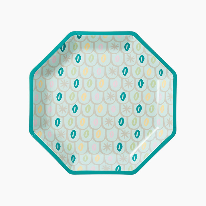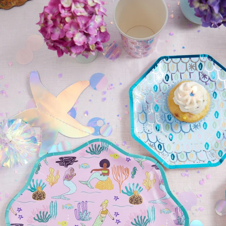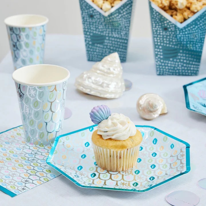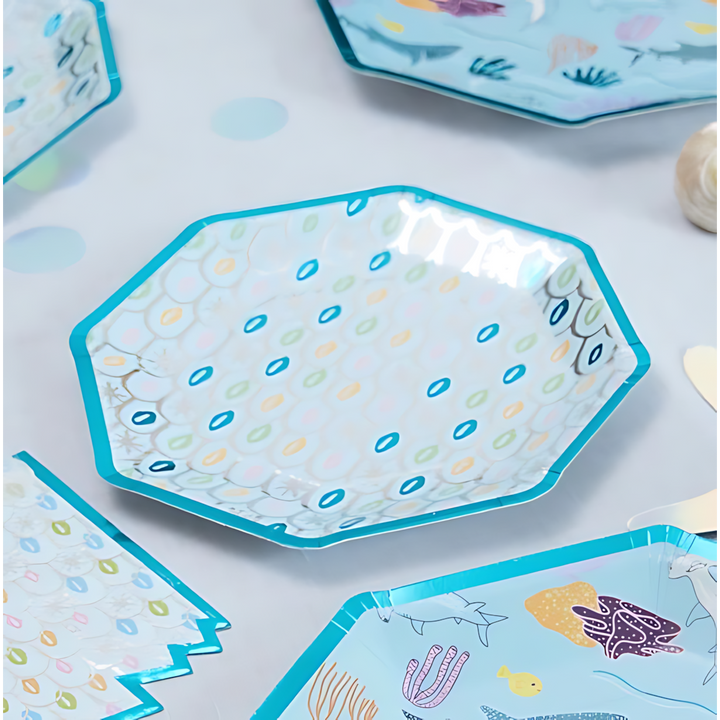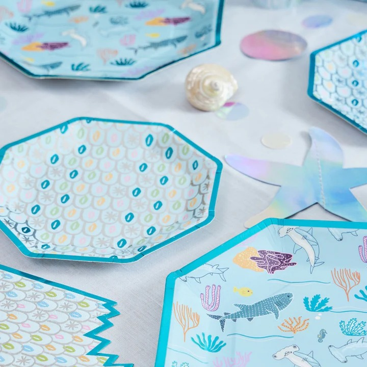 Make a splash at your next celebration with the Shark Dessert Plates. These 7-inch plates feature a captivating blue hue complemented by shimmering silver foil accents and an intricate fish scale design, bringing an oceanic touch to your table setting. Perfect for shark-themed parties, birthdays, or any maritime-inspired event, they add a delightful flair to your décor.
