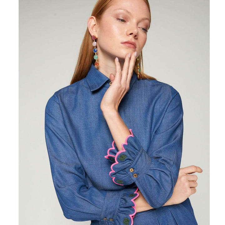 Vilagallo Shirt Denim With Fuchsia Wave Embroidery