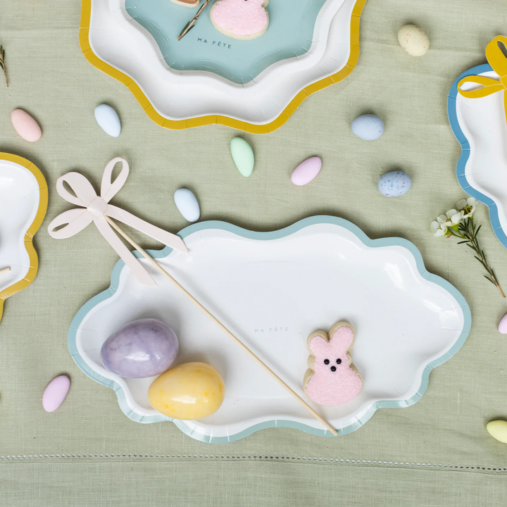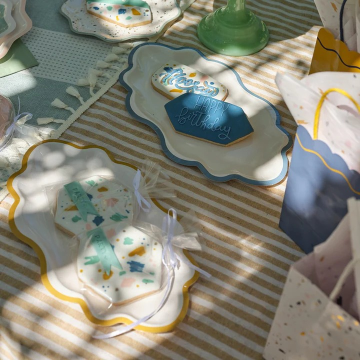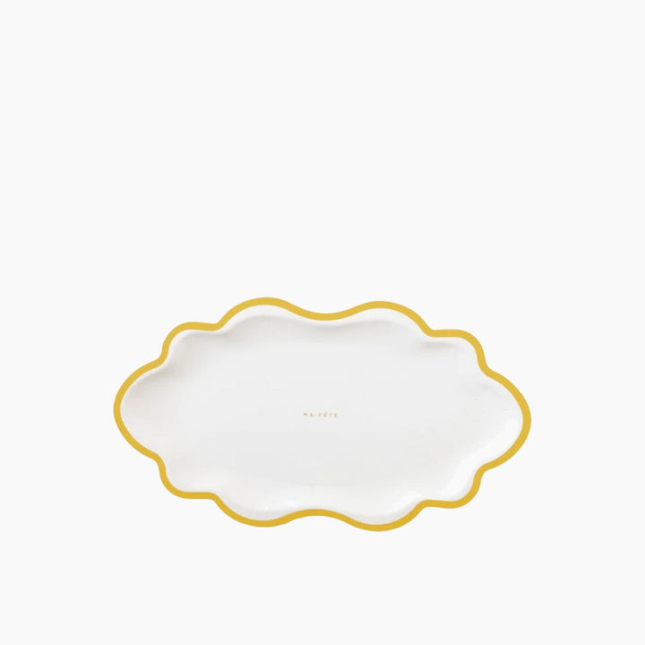 Elevate your next gathering with a stylish and functional addition to any event. These white platters with mustard edges offer a modern twist on traditional serving ware, making them perfect for showcasing appetizers, desserts, or small bites.