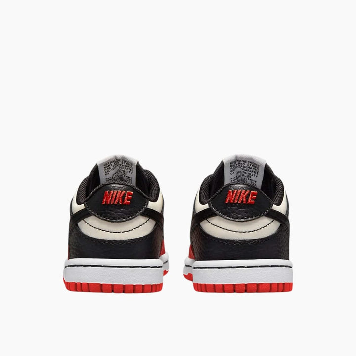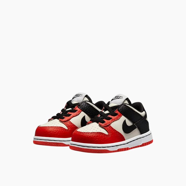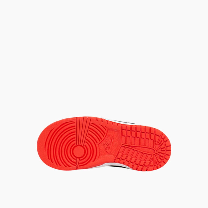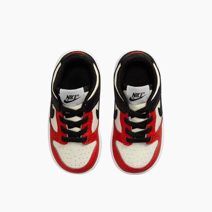 This toddler-size sneaker showcases an all-leather upper that features a white foundation complemented by Chile Red and black heel overlays. The sneaker is further accentuated with black hues on the collar flaps, heel tab, Nike Swoosh, and laces, along with a "Chile Red" overlay on the mudguard and eye stays. Its uppers are crafted from smooth sail leather, ensuring both comfort and style. The branding includes a red Nike wordmark stitched on the heel tab, a woven tongue tag commemorating the shoe's 75th anniversary, and a black leather Swoosh on both the lateral and medial sides. Additionally, a pair of metallic lace dubrae with a diamond motif serves as a clear reference to the NBA's diamond anniversary. The design is completed with red outsole bottoms, black contrast stitching, and white midsoles.