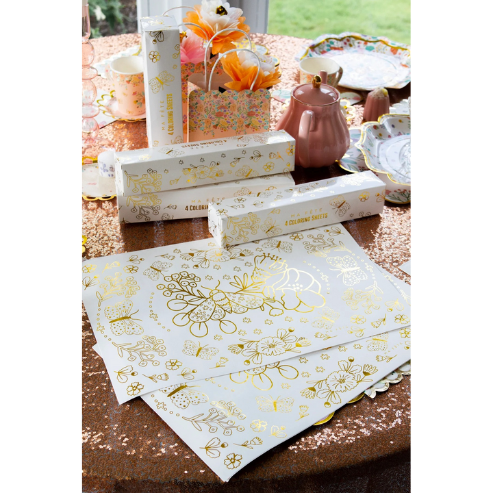 Enhance your next tea party with these charming coloring sheets. Designed to captivate young guests, each sheet features delightful floral and butterfly illustrations accented with elegant gold foil outlines. Perfect as both a creative activity and a decorative touch, these coloring sheets add a whimsical flair to any gathering.