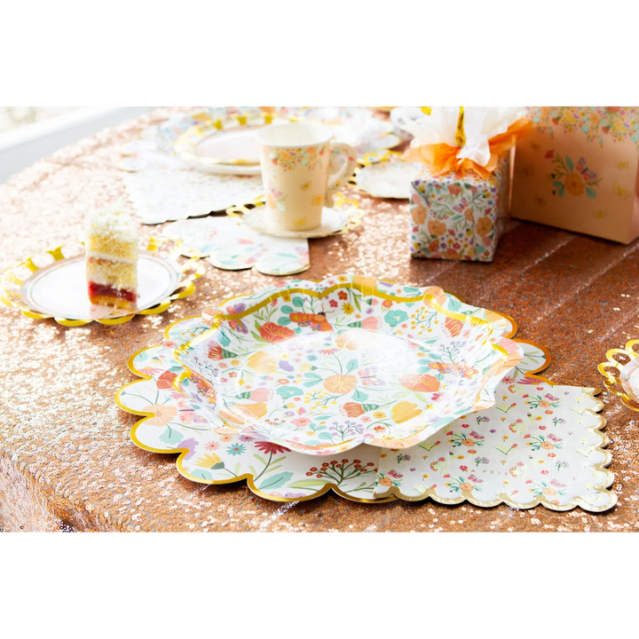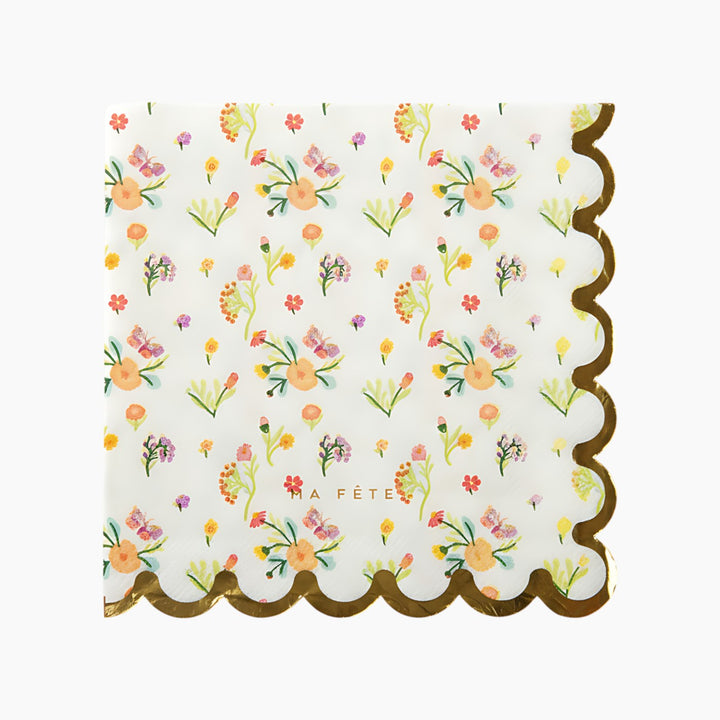 Enhance your next celebration, designed to add a touch of elegance to any gathering. These napkins feature a charming floral pattern accented with gold foil and scalloped edges, making them the perfect complement to your dinner plates and party decor.