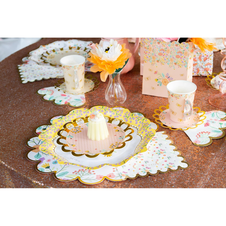 - Design: Floral and butterfly print with scalloped edges and gold foil accents