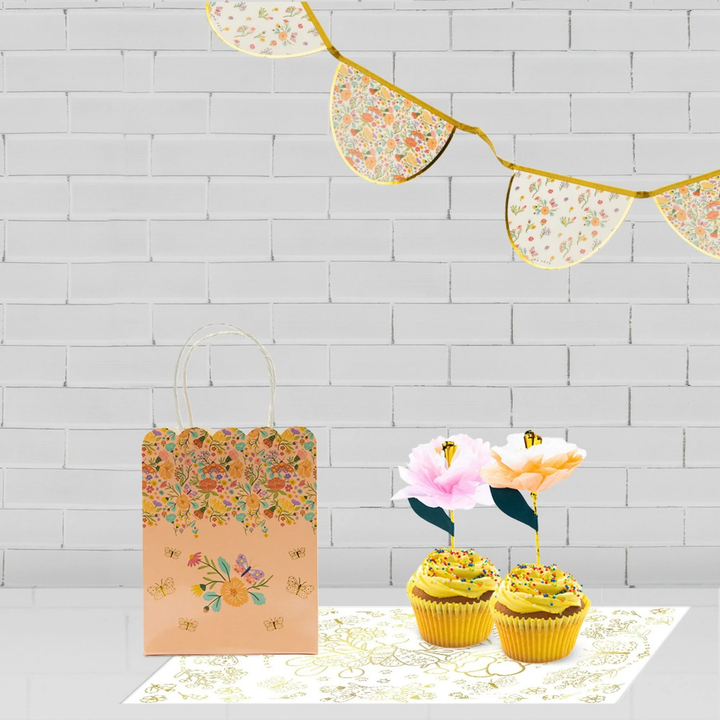 - Elegant gift bags adorned with vibrant garden florals and golden accents, perfect for party favors or as decorative totes.