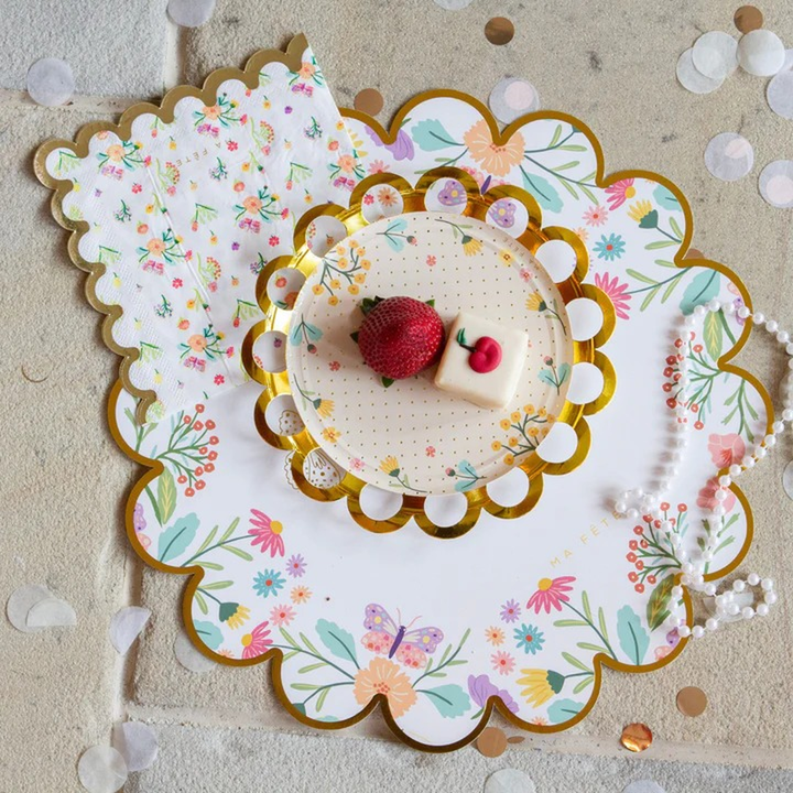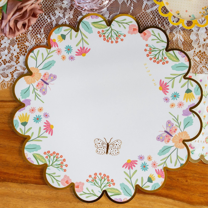 - Comes with 8 paper placemats (13") featuring gold foil butterflies and scalloped edges