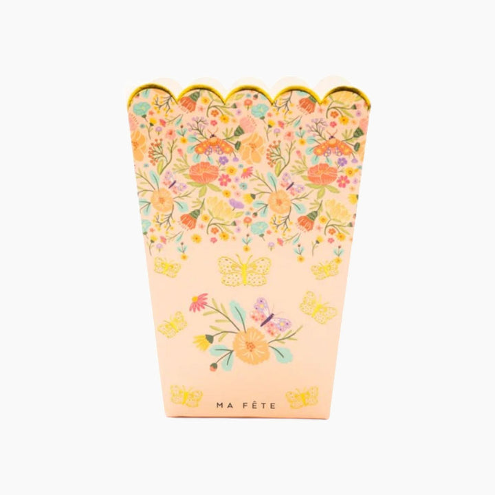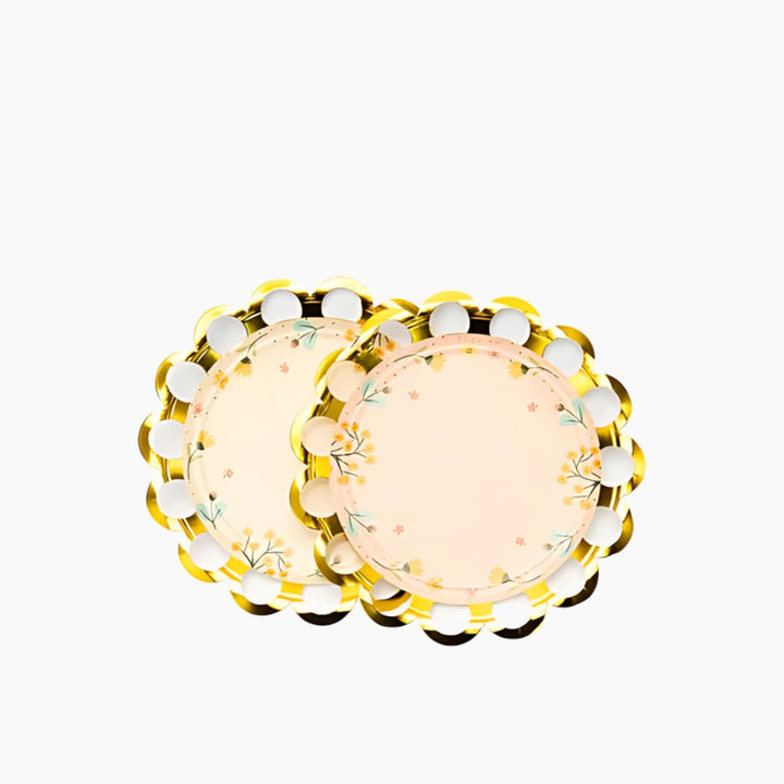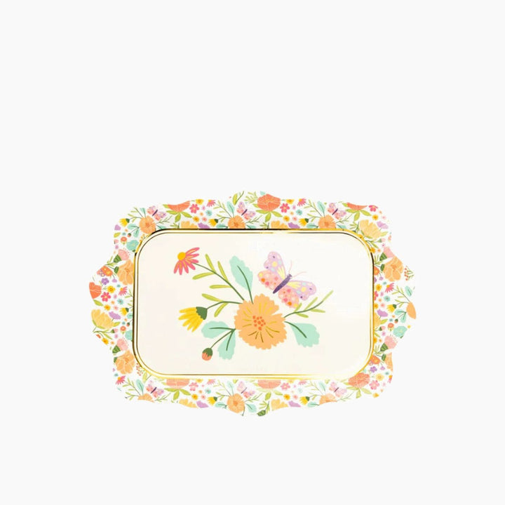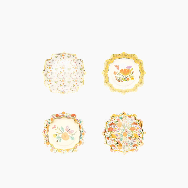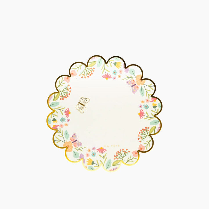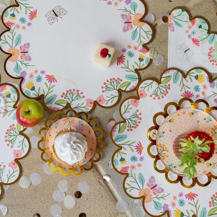 - Round paper placemats featuring a garden of flowers and intricate golden butterflies, setting the scene for a serene tea party.