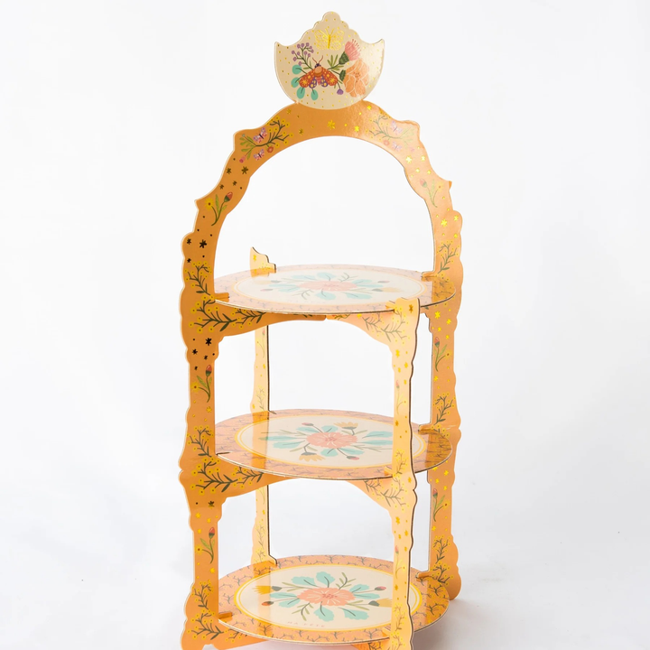 - Elegant tiered paper stand with delicate cut-out patterns and ornate floral designs, ideal for displaying tea-time treats.