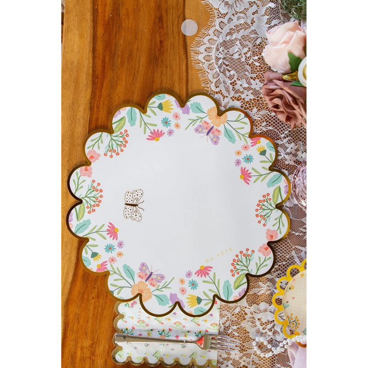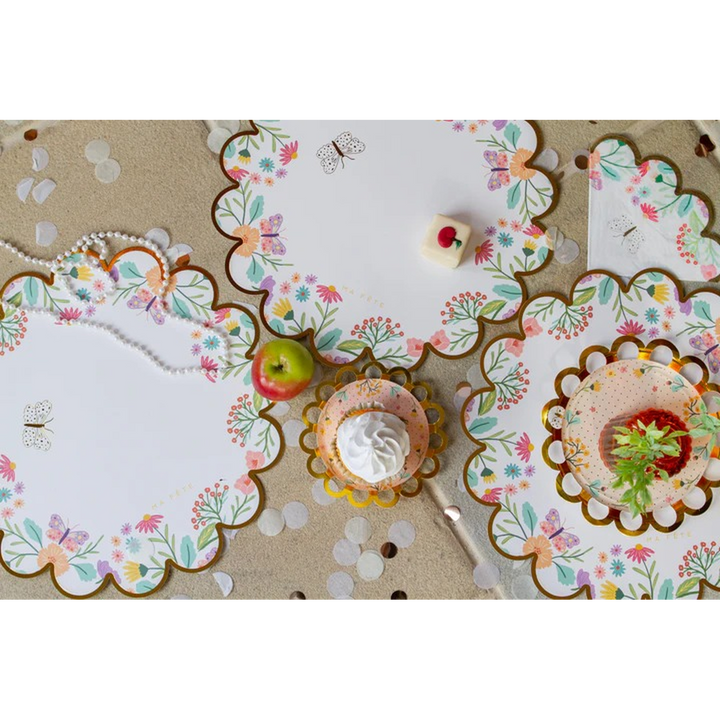 Enhance your table setting with a delightful blend of elegance and practicality. Designed to bring a touch of charm to any occasion, these placemats feature a delicate floral pattern accented with butterflies, scalloped edges, and shimmering gold foil details. Perfect for birthdays, garden parties, or everyday meals, they effortlessly combine style with convenience.