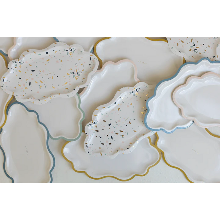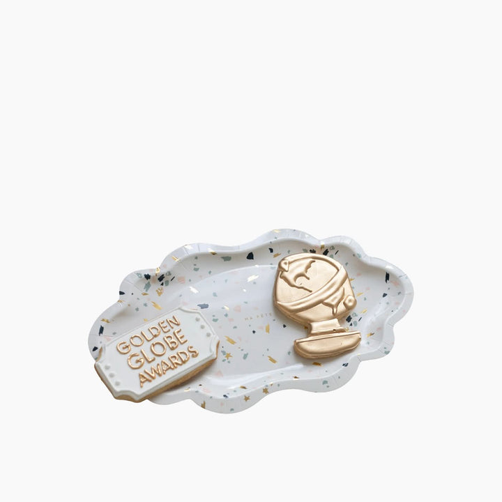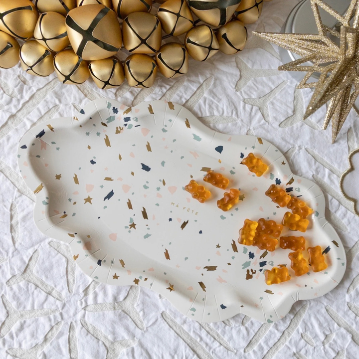 Elevate any gathering with a chic blend of contemporary design and timeless elegance. Crafted to emulate the refined aesthetics of Italian terrazzo pottery, these trays introduce a touch of sophistication to your table setting. The addition of gold foil detailing further enhances their luxurious appeal, making them an ideal choice for upscale events and celebrations.