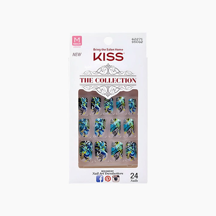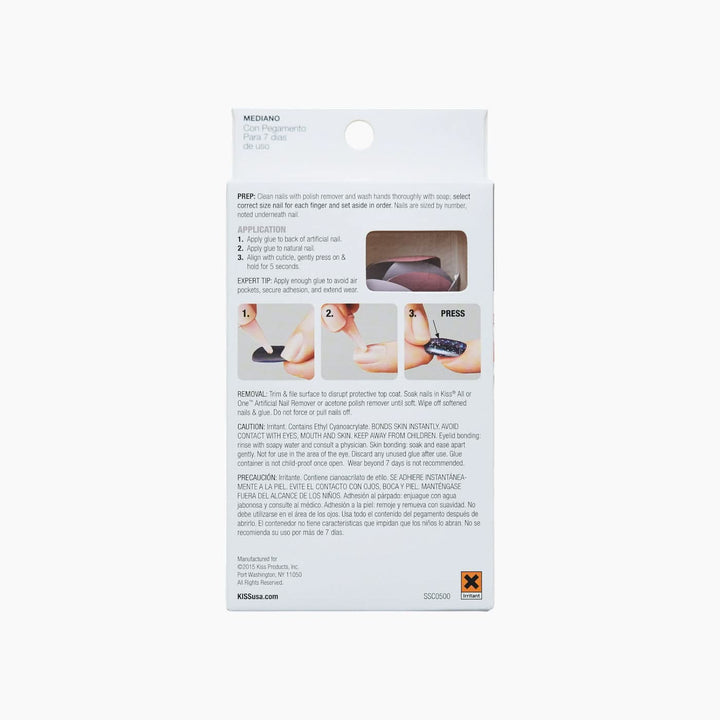 Remove: Trim and file the nail surface to break the seal, then soak in Kiss All or One Artificial Nail Remover (or acetone-based remover) until soft. Wipe off gently—do not pull or force nails.