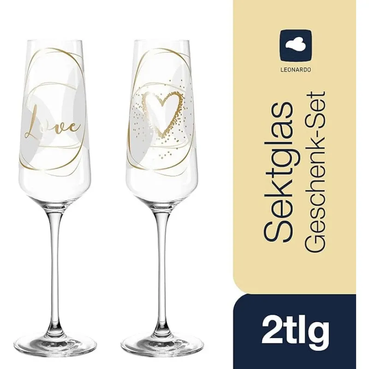 The Leonardo Love 280ml 2-Piece Set is a stunning addition to your glassware collection. Each glass features a unique design with gold accents and a heart pattern, making them ideal for special occasions. Thanks to the straight base plate, there are no pools of water on the upside-down glasses in the dishwasher. The Teqton glass formula developed by Leonardo ensures that these champagne glasses are particularly strong and shock-resistant, providing a perfect tasting experience for sparkling drinks.