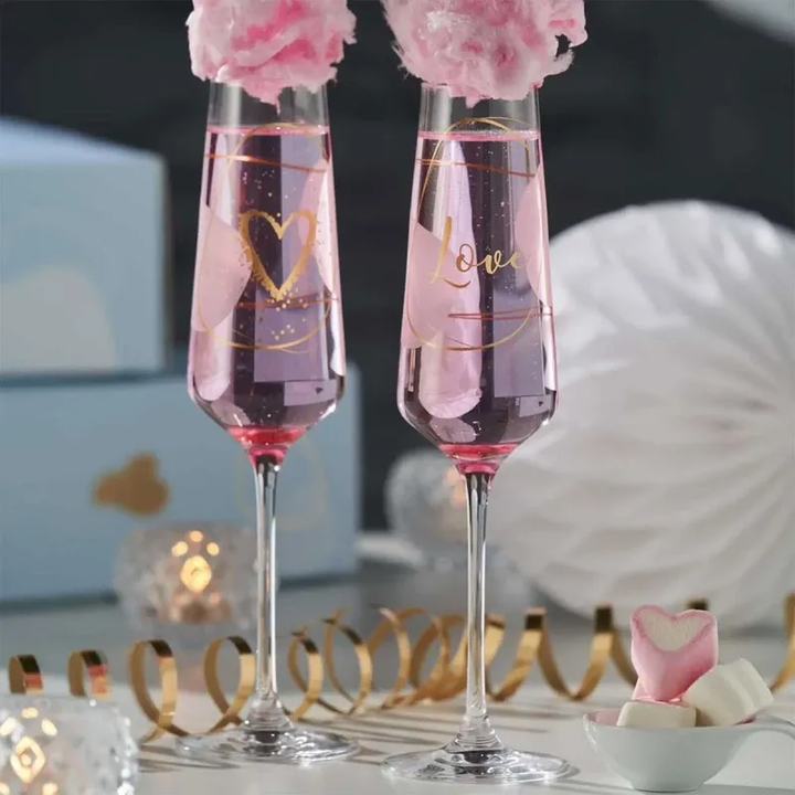 This set includes 2 champagne glasses with a love print and heart pattern, designed to elevate your drinking experience. The glasses are equipped with legs and are dishwasher safe, ensuring easy care and durability.